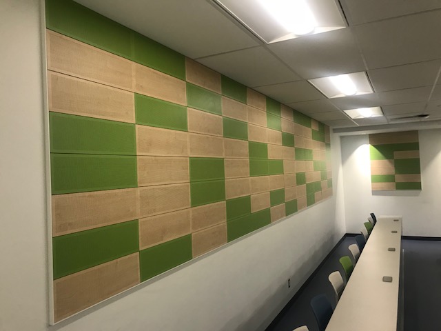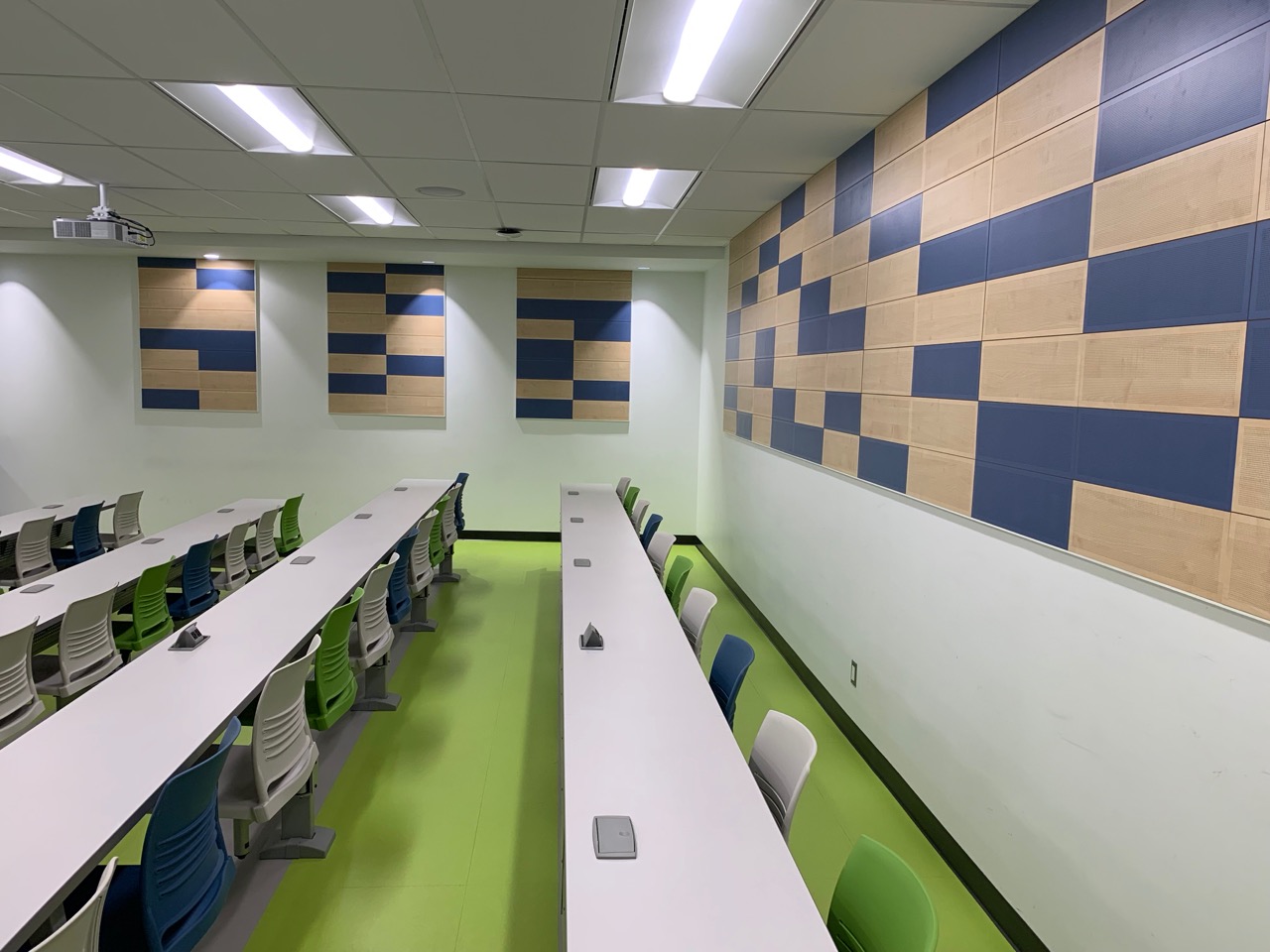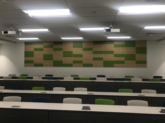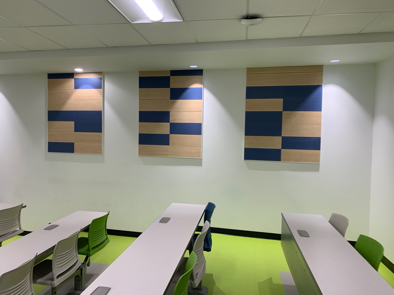 Carbon Zero HPL panels were perforated and backed with acoustical abosorber and framed to create large sound absorptive surfaces.