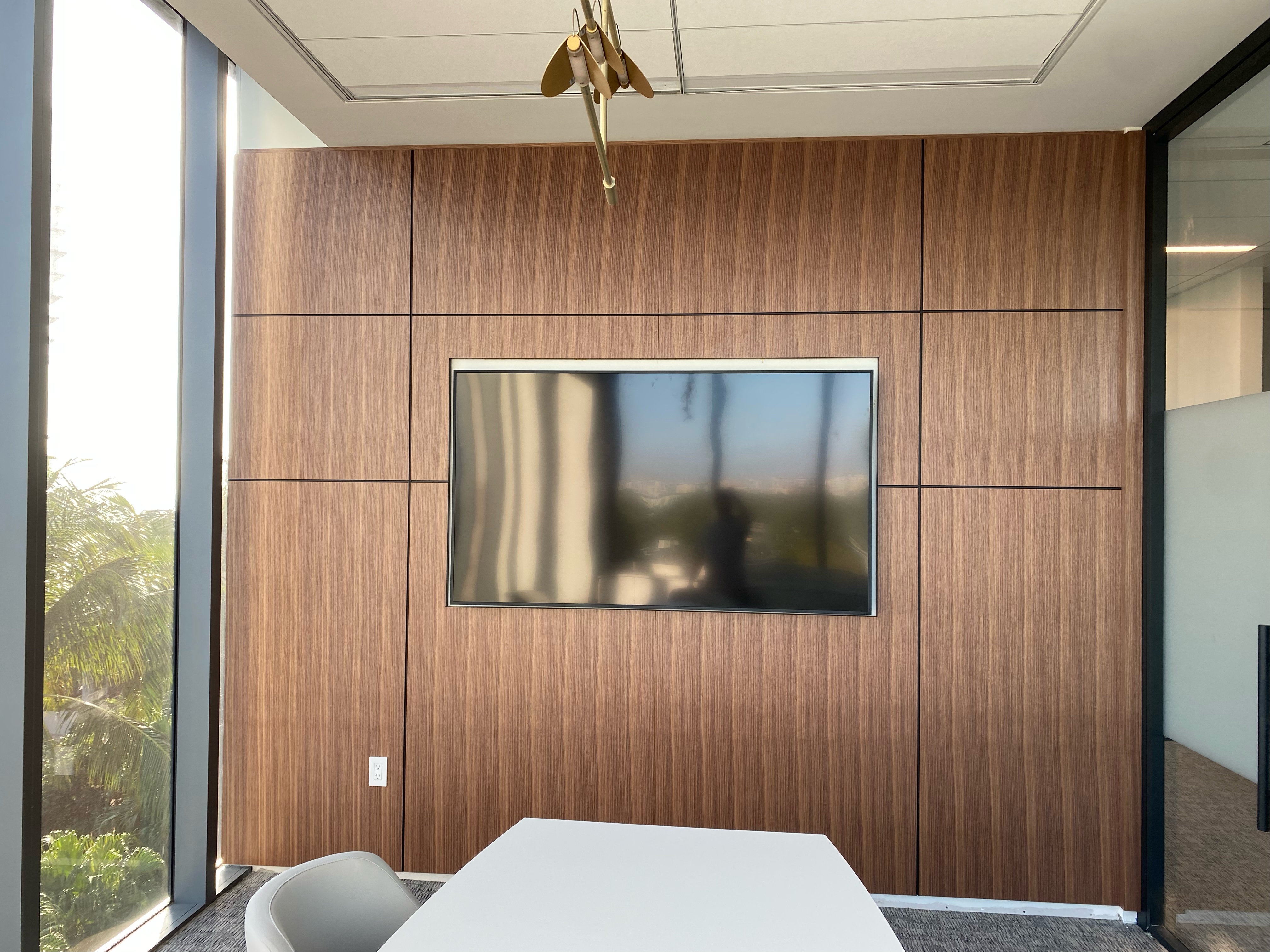 Prefinished and sequenced natural veneer sheets are applied directly to drywall in the same way as any other wallcovering delivering beautiful book-matched (and end-matched) elevations that are a perfect VE for architectural panels.